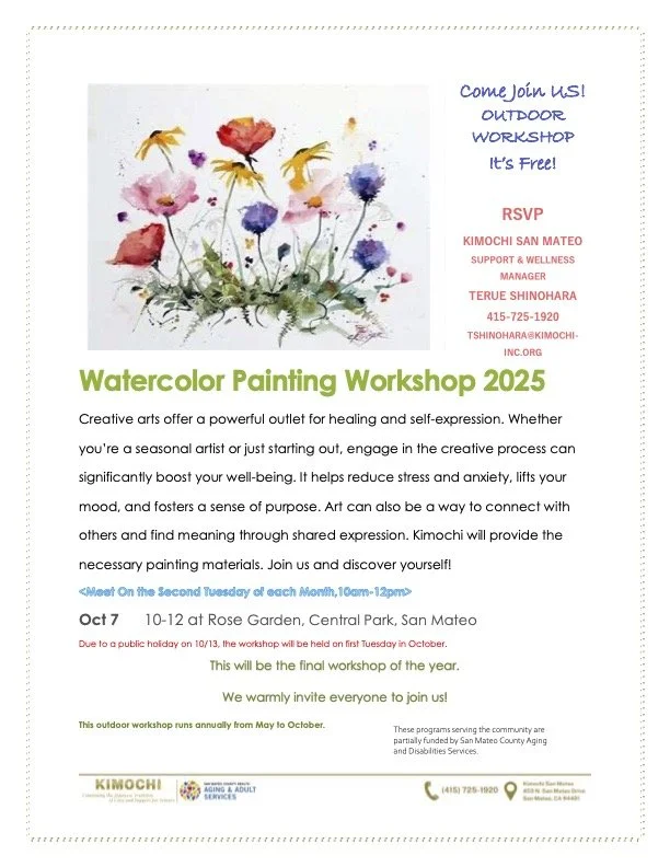 The purpose of the Support Group meeting is to share experiences and ideas to ease the stress of caregiving. Meetings are facilitated by a Kimochi Case Manager. Note: the date and time are subject to change. Please call (415) 931-2275 if you are attending for the first time.