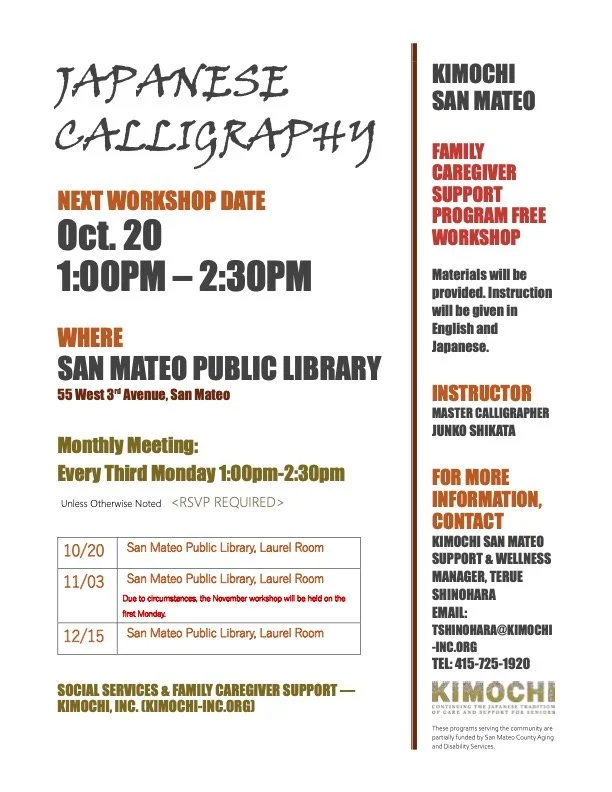 For more information about Kimochi Family Caregiver Support services in San Mateo, please contact: Terue Shinohara, Support and Wellness Manager,tshinohara@kimochi-inc.org Tel: (415) 725-1920